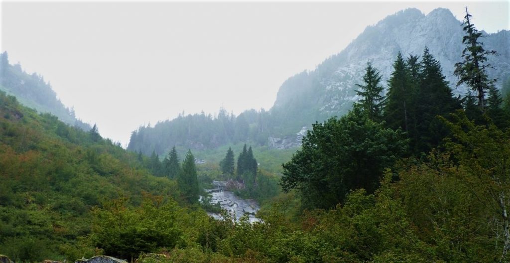 As you continue your hike you will notice old pipes from the waterlines, ore drills and how the huge boulders were once used as counterweights. Poke around and enjoy this historical place but leave it intact for others to enjoy. Just before reaching Copper Creek, you’ll notice a long pipeline going uphill. This brought water down to the camp. Along this pipeline are the remains of the old Forest Service Copper Creek Trail, a path that was abandoned many years ago. When you stand at Copper Creek and look up, you are seeing Windy Pass where the mine was located. Sometimes you’ll see the bare rock, sometimes, earlier in the season, you’ll see the amazing Bornite Falls.