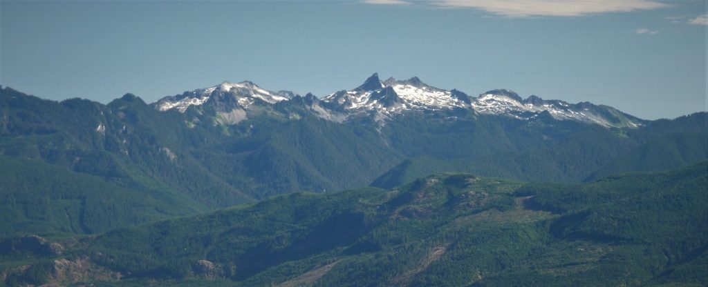 Upon this small level clearing once stood the mining cabin of Chas Neiderprum. Beyond this point the trail is scarcely marked and disappears in the brush. Continuing further begins the climber’s route to the upper reaches of Whitehorse Mountain. As you make your way back down the trail imagine, if you will, a man leading pack horses laden with heavy ore making this same trip day after day. As this is recognized as a well used climbing trail the Forest Service has added improvements to the switchbacks helping to form a more gradual descent.